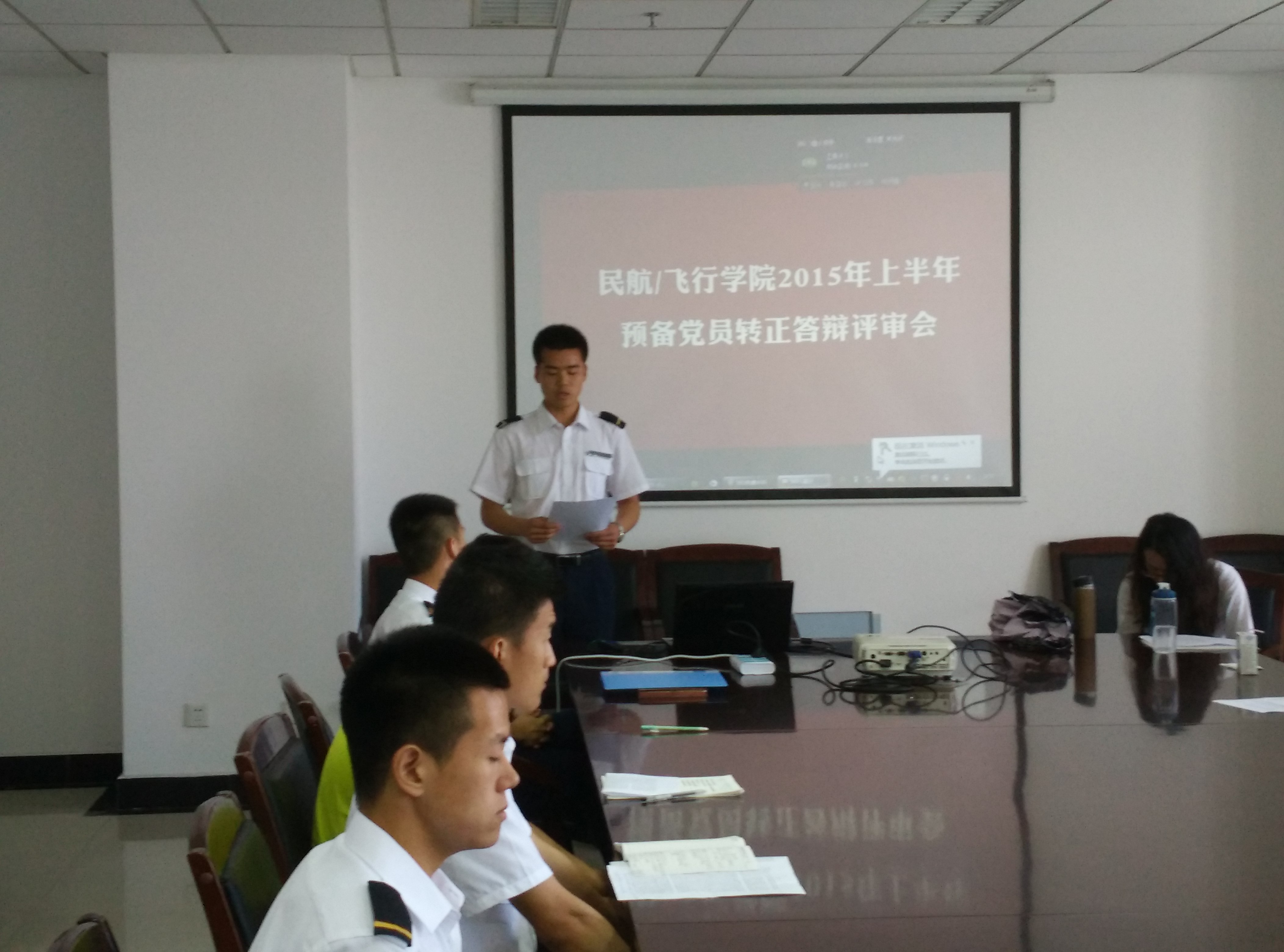 2015年5月21日上午9点,午夜巴黎 2015年上半年预备党员转正公开答辩在1号楼20楼会议室举行。本次答辩的评委由党政办汪明芳、学院团委书记傅成成、飞行技术专业辅导员张学财、各年级辅导员以及党员代表组成,部分入党积极分子也聆听了本次答辩评审会。