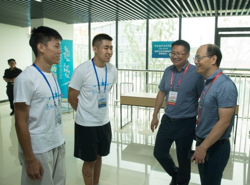 学院领导与迎新工作人员、学生志愿者交谈