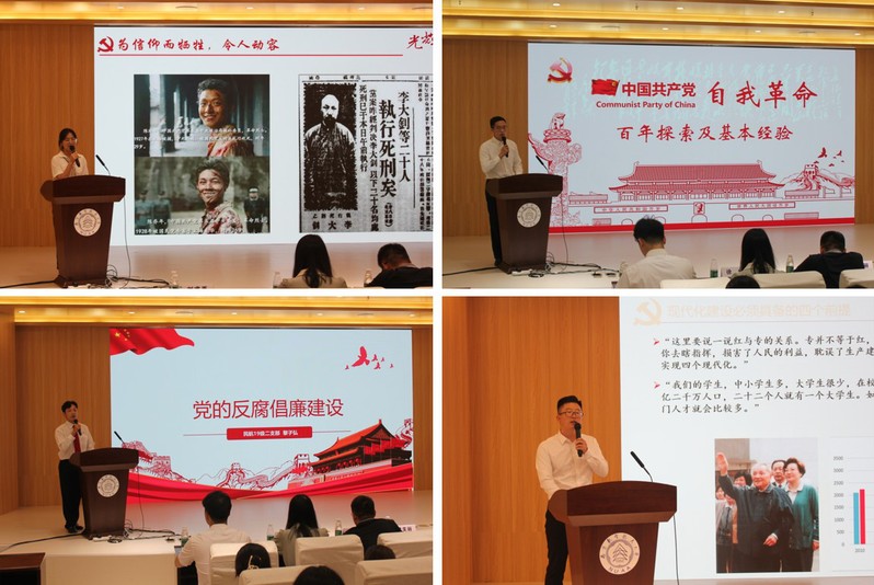 各党支部从不同角度回顾了党的奋斗历程,来自20级硕士第一党支部的褚晓同志强调了树立正确党史观的重要性,并提出了树立正确党史观的方法;20级硕士第二党支部的刘珂琛同志以自我革命为出发点,介绍了中国共产党自我革命的实践探索及历史经验;19级硕士生第二党支部的黎子弘同志着重介绍了党反腐倡廉建设的重要性及意义;博士第二党支部的蔺瑞管同志带领大家重温了邓小平同志的《目前的形势和任务》;博士第一党支部的俞垚魏同志则以载人航天精神为主线,与大家一同进行自我鞭策。除了由各支部推选出的优秀党课,20级党支部书记王雨薇、徐灿分别带来《伟大事业需要伟大精神——杰出楷模周恩来》和《中国崛起,民航腾飞》的示范党课。