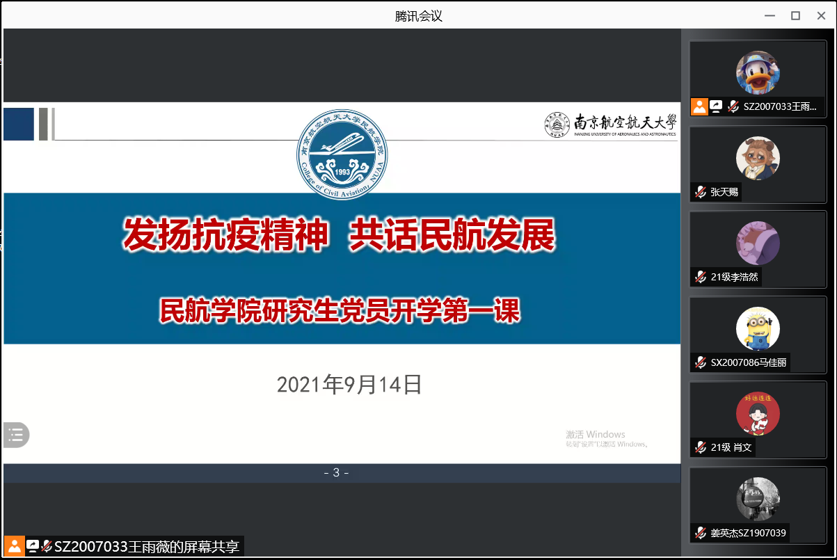 为传达学校疫情防控工作及相关要求,加强新老生的交流互动,同时帮助21级研究生新生形成对学院的认同感、归属感,尽快找准目标定位,走好“研途”,9月14日,午夜巴黎 党委书记刘建成为研究生党员作了题为《发扬抗疫精神 共话民航发展》的党课暨“开学第一课”。会议以线上形式召开,组织员侯美丽、组宣干事童肖、研究生辅导员及全体研究生党员和入党积极分子共200余人参加了会议。会议由学院20级研究生党支部书记王雨薇主持。