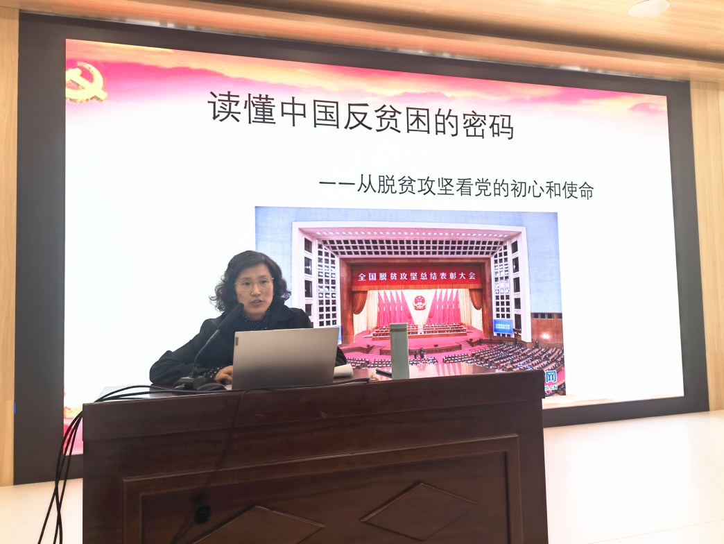 开班动员会后,学院邀请马克思主义学院副教授薛葵作《读懂中国反贫困的密码——从脱贫攻坚看党的初心和使命》专题党课宣讲。从四个方面深度阐述了中国共产党的初心和使命,以及在脱贫工作中所取得的巨大成就:一是中国反贫困取得的历史性功绩;二是中国科学合理的贫困标准制定;三是“不忘初心、牢记使命”的脱贫攻坚战成功秘诀;四是中国共产党坚持的人民至上,共同富裕的基本理念。薛老师动情讲述“李保国”、“张桂梅”、“黄文秀”等优秀脱贫攻坚战代表人物的光荣事迹,展示了中国共产党脱贫攻坚的决心与行动。薛葵老师希望各位同学能从这节党课中学有所得,从中国的脱贫攻坚路理解中国共产党的初心和使命,同时也能深入思考自己的入党初心。