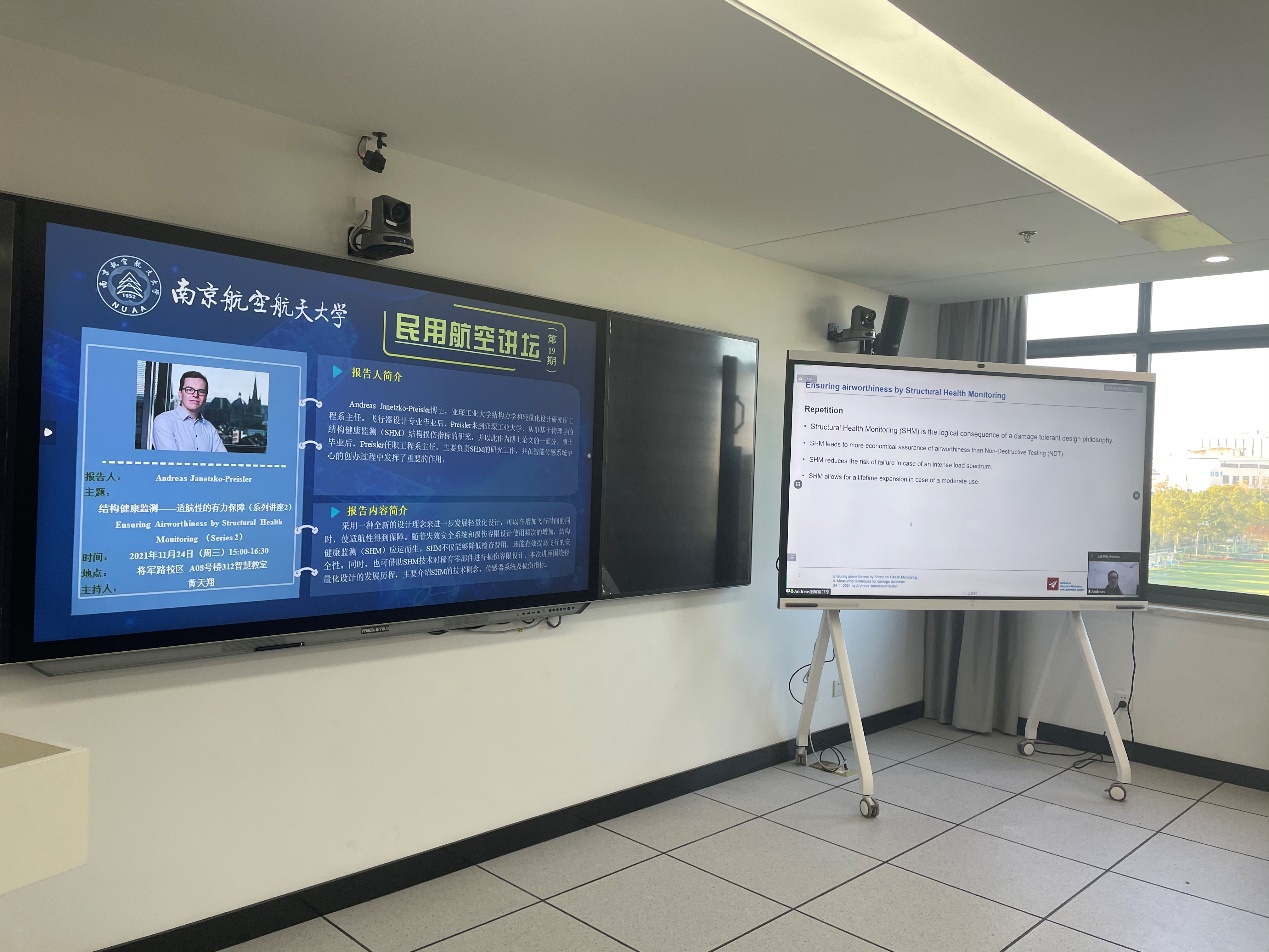 11月24日下午,“民用航空讲坛”第十九期讲座成功举行,讲座采用了线上线下相结合的形式,线下会场设置在将军路校区A08号楼312智慧教室。本次讲座由午夜巴黎 黄天翔老师主持。德国亚琛工业大学结构力学和轻量化设计研究所(SLA)工程系主任Andreas Janetzko-Preisler受邀为师生带来了一场围绕结构健康监测展开的线上讲座。