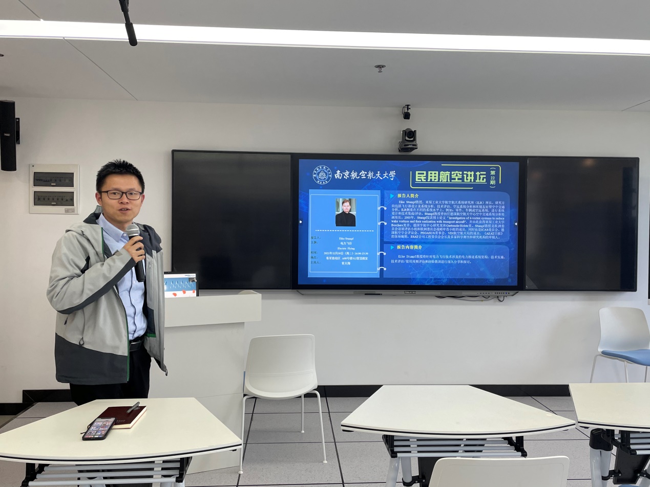 11月30日下午,“民用航空讲坛”第二十二期讲座采用线上线下相结合的形式成功举行,线下会场设置在将军路校区A08号楼312智慧教室。本次讲座由午夜巴黎 黄天翔老师主持。德国亚琛工业大学航空航天系统研究所(ILR)所长Eike Stumpf教授再次受邀为师生带来了一场围绕空中的士展开的线上讲座。