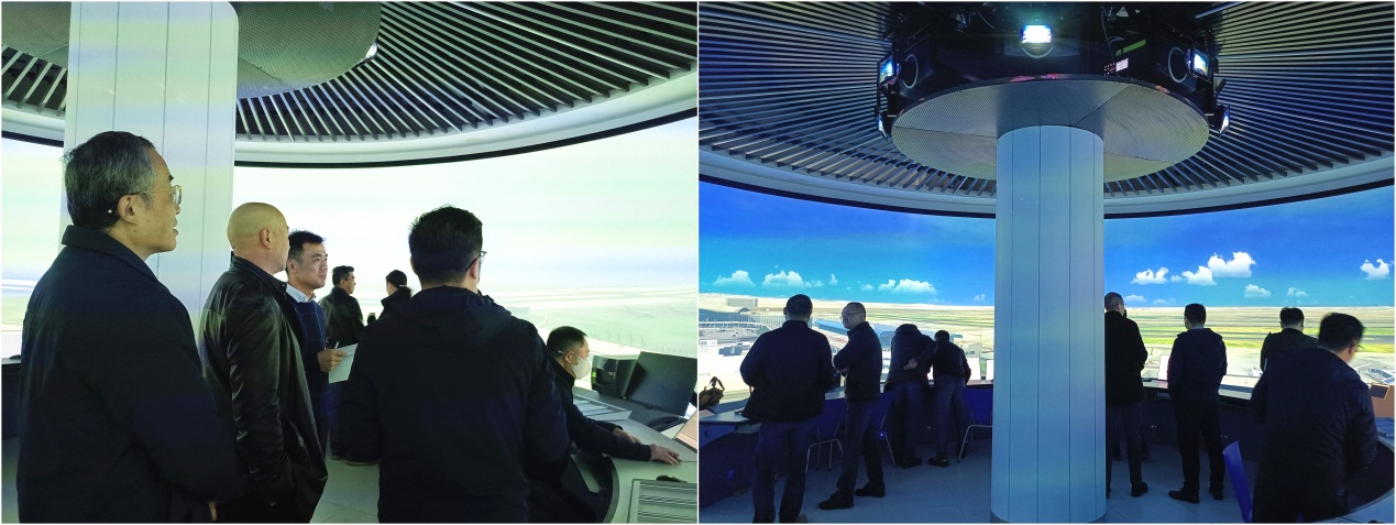 空中交通系主任田勇和莱斯公司项目经理张翔分别介绍了项目概况和系统研制情况。360°全景塔台模拟训练系统是工信部和民航局共建重点建设项目,项目预算1140万,也是部局共建项目中首个过千万的项目,该系统配备沉浸式的塔台场面视景与仿真设施,是空管系统管制人才培养与科研仿真关键核心设施。该系统建设项目从采购、招标到建设历经一年半时间,其间克服南京疫情、房间渗水、安全整改等众多困难,于11月底完成测试,达到验收条件。