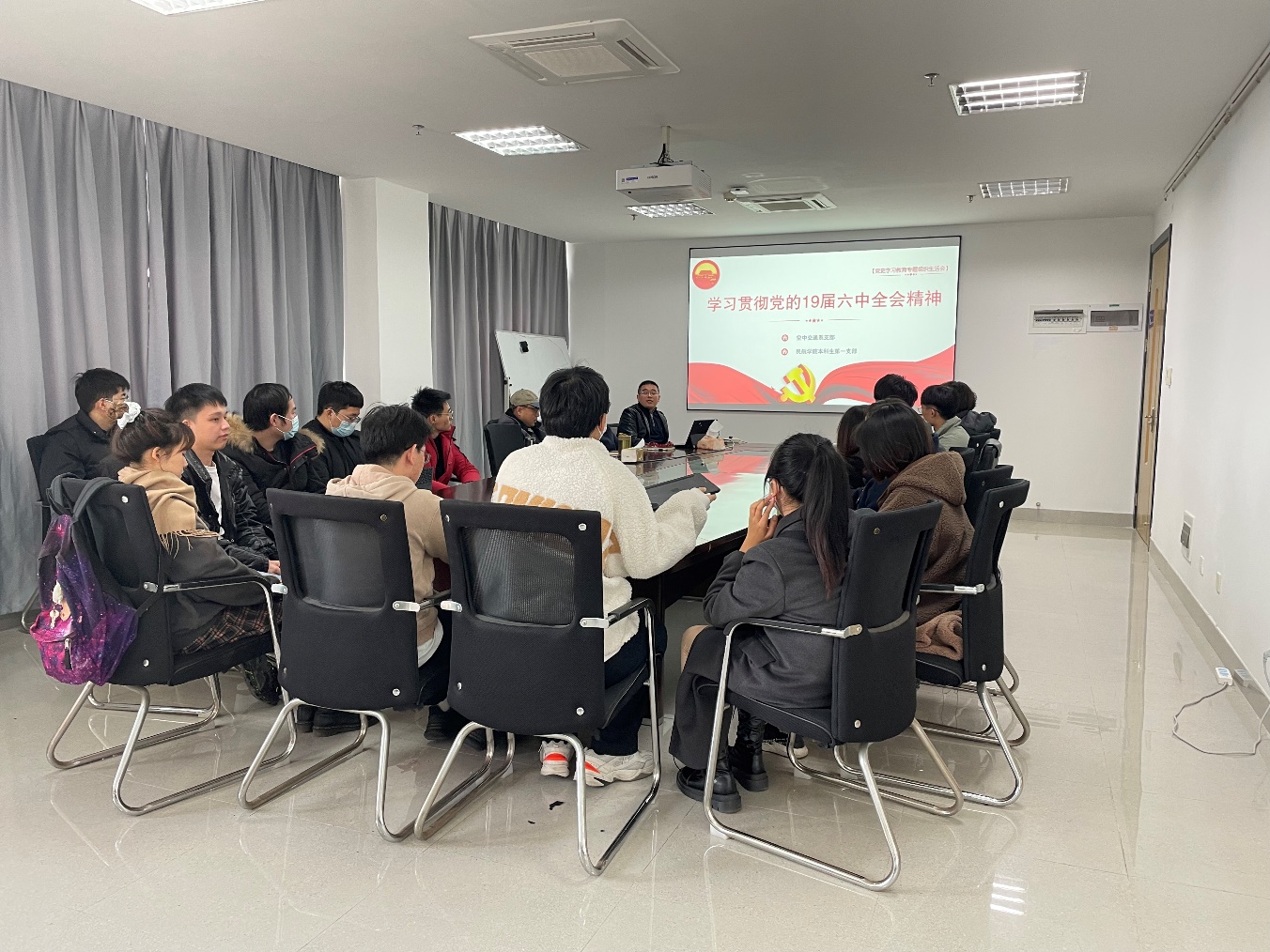 12月21日,为学习贯彻党的十九届六中全会精神,午夜巴黎 空中交通系党支部联合本科生第一支部开展主题党课联学活动。午夜巴黎 党委委员、空中交通系主任田勇,空中交通系党支部委员及本科生第一党支部19级学生党员参加本次交流。本次党课由空管系支部书记张军峰主持,包含两项议程:《中共中央关于党的百年奋斗重大成就和历史经验的决议》学习和本科毕设交流。