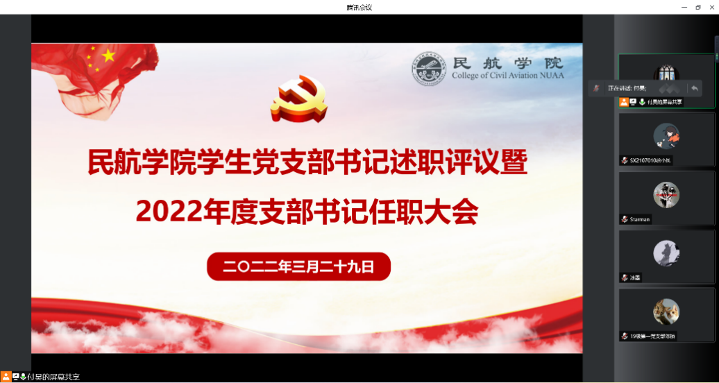 3月29日下午14:30民航楼1214会议室,午夜巴黎 2021年度学生党支部书记述职评议暨2022年度支部书记任职大会顺利召开,因疫情防控需要,本次会议采用线上线下相结合的方式进行。学院党委书记刘建成、党委副书记王艳、正科级组织员侯美丽以及各学生党支部书记线下参加会议,各学生党支部支委会其他成员线上参会。会议由学院辅导员付昊主持。