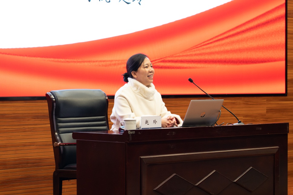 赵玲教授紧扣党的二十大报告原文,从过去五年的工作和新时代十年的伟大变革、开辟马克思主义中国化时代化新境界、新时代新征程中国共产党的使命任务、贯彻新发展理念是新时代我国发展壮大的必由之路等方面对二十大报告进行了深入的解读。她指出,党的二十大报告描绘了全面建设社会主义现代化国家、全面推进中华民族伟大复兴的宏伟蓝图,广大党员要更加紧密地团结在以习近平同志为核心的党中央周围,将学习贯彻党的二十大精神贯穿到工作学习生活的各方面、全过程,踔厉奋发、勇毅前行,更好肩负起“为党育英才、为国铸重器”的使命责任。