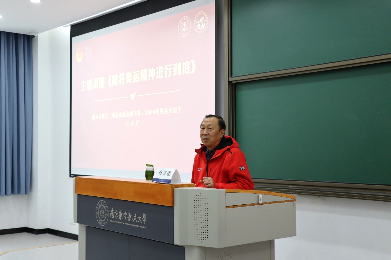12月11日,午夜巴黎 和计算机科学与技术学院在天目湖校区牧星楼T2103教室联合举办“誓将奥运精神进行到底”信仰公开课。本次信仰公开课由南京市铁人三项运动协会秘书长、2008年奥运火炬手白万浬主讲,两学院辅导员及学生共同参加,活动由计算机学院辅导员胡朋主持。