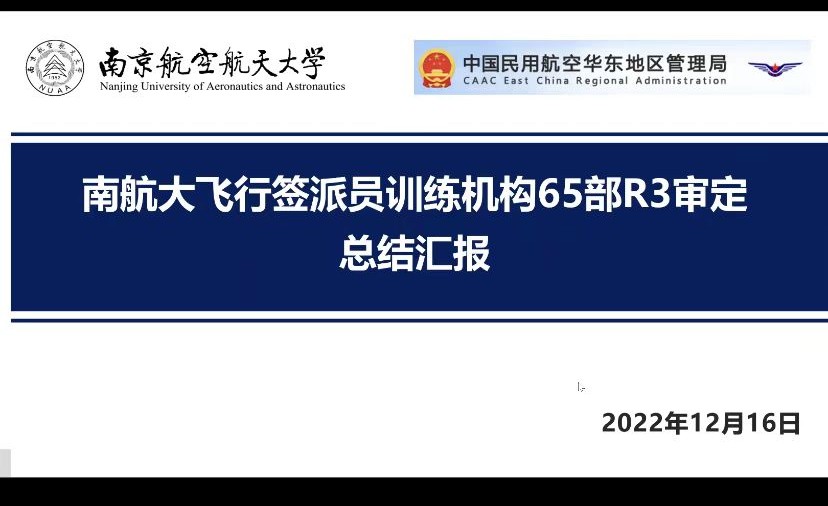 飞行签派员训练机构65部R3审定总结会议顺利举行,民航华东管理局航务处处长李文海、航务监察员孙卉、江苏监管局航务处处长郭久宏、航务监察员李海元、汪梦蝶以及华东地区签派委任代表等出席会议。学院院长孙建红,副院长田勇、空管与签派专业负责人及机关相关办公室负责人参加,受疫情影响本次会议采取线上的方式进行,会议由民航华东管理局孙卉主持。