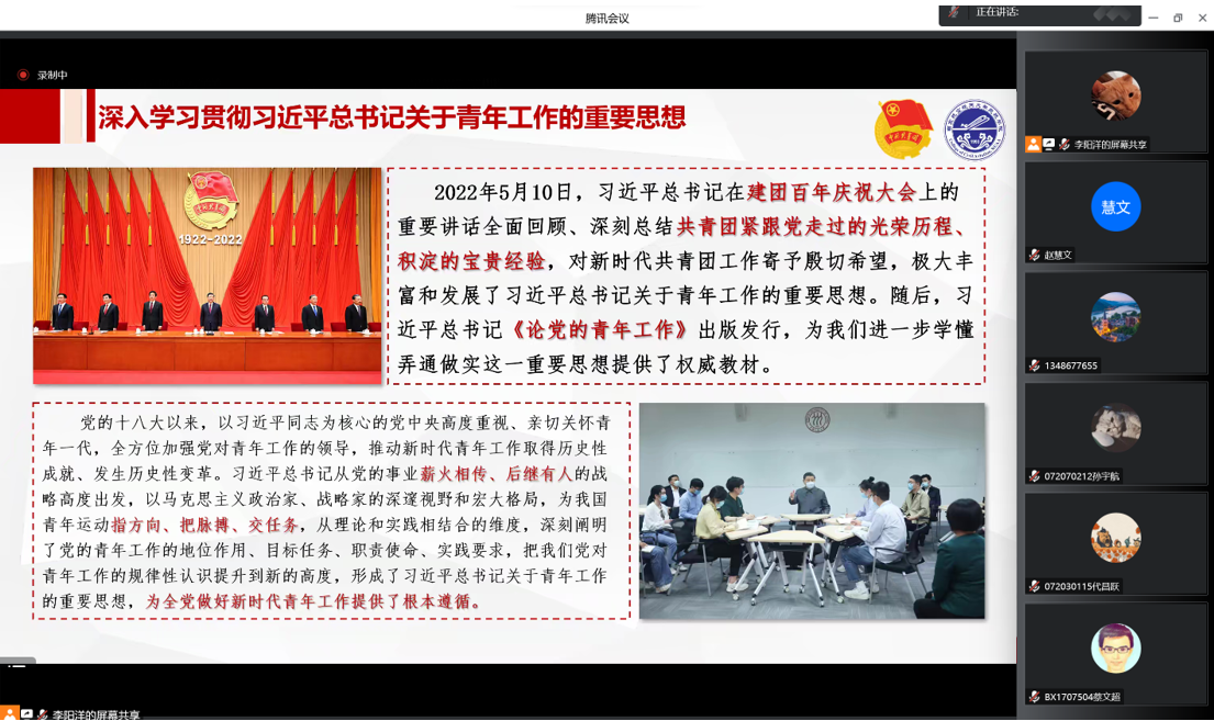 接下来,赵慧文带领大家回顾习近平总书记在建团百年庆祝大会上的重要讲话,强调为实现中华民族伟大复兴的中国梦而奋斗,是中国青年运动的时代主题,希望广大团干部们对自己的工作职责有了更深刻的理解。