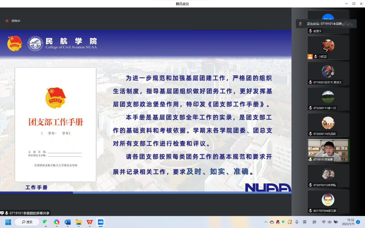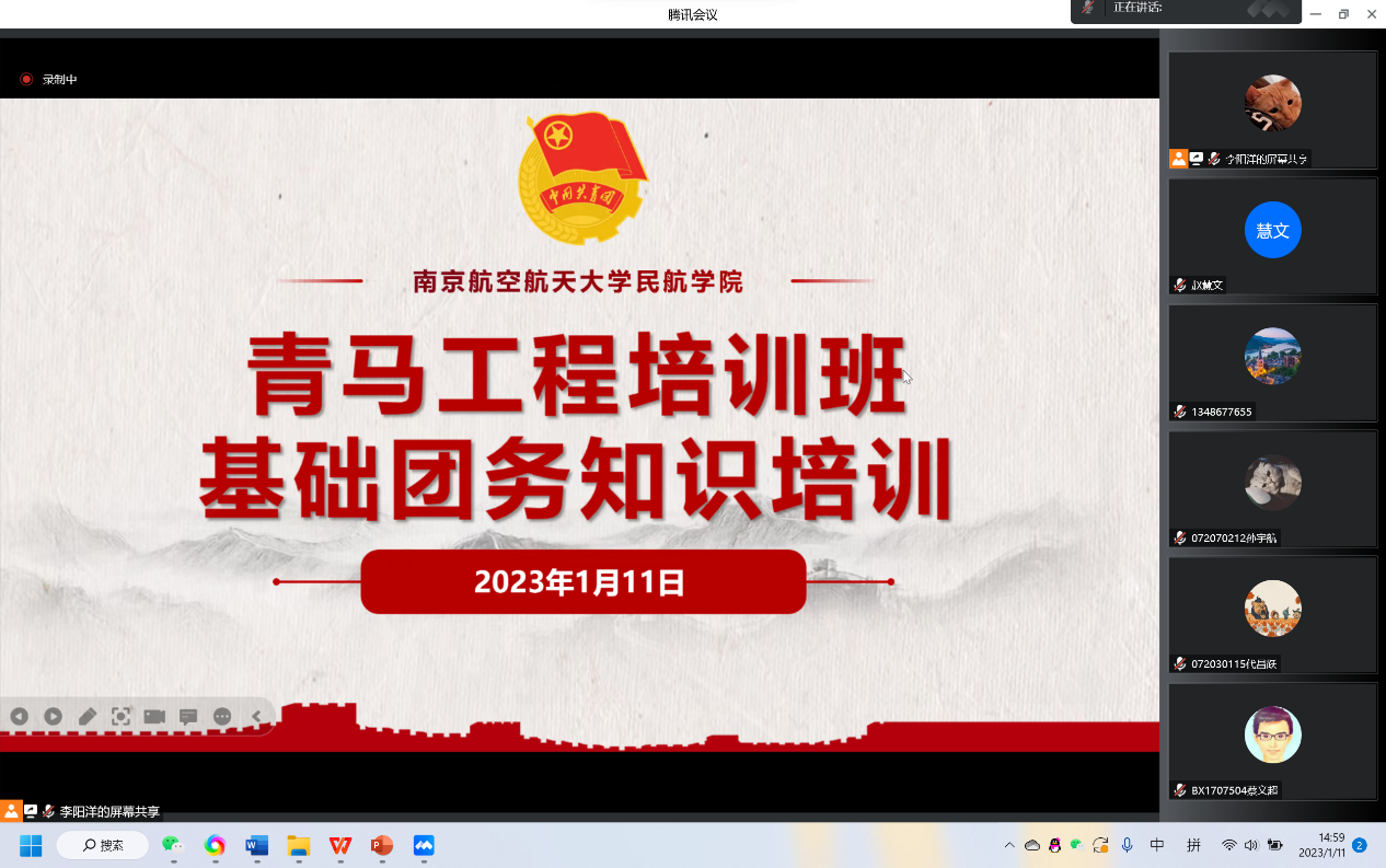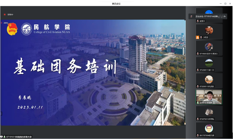 为提高基层团学组织骨干的理论基础和业务水平,进一步加强青年的思想政治引领,2023年1月11日下午,午夜巴黎 于线上开展青马工程培训班之基础团务知识培训。午夜巴黎 团委书记赵慧文、19级本科生优秀团干李展鹏、午夜巴黎 团委副书记李阳洋和全院团支书、团总支参与此次培训。