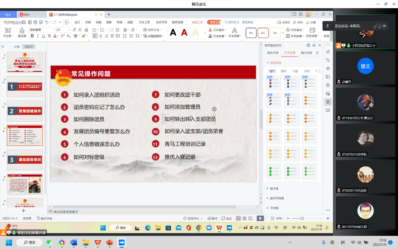 随后,李阳洋进行智慧团建操作指导,逐一分析12个常见操作问题。她在培训过程中详细进行示范操作,向团支书们系统地展示了如何在智慧团建中进行日常团务工作的录入,帮助团支书加强数字化、智能化团务工作技能。