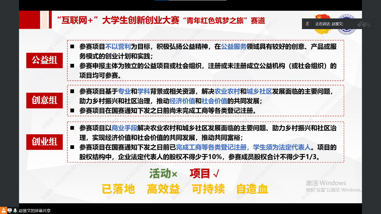 她特别强调,各备赛团队无论是立足专业技术还是实践成果,一定要认真总结凝练项目模式,而不是以单次活动总结参赛。要抓住重点人、重点事出发,构想项目,注重外部资源运用。同时要打造自造血能力,真正形成已落地、高效益、可持续的参赛项目。