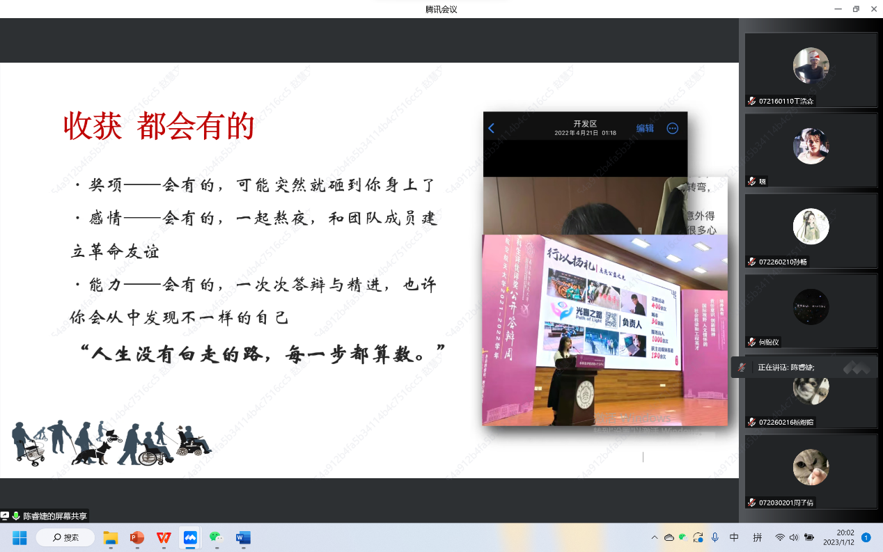 随后,曾带领“光盲之路”助盲团队多次获得省级荣誉、已直博至同济大学的19级本科生陈睿婕为大家做比赛经验分享。她从项目背景、产品介绍、成效展示等方面逐一介绍了“光盲之路”陪伴助力盲人出行项目的路演逻辑和展示内容。并从参赛中收获到的个人能力提升、团队协作友谊、多项荣誉肯定等方面,鼓励同学们大胆想、勇敢创,不畏艰苦、反复钻研,相信所有的努力,一定会有兑现的时刻!