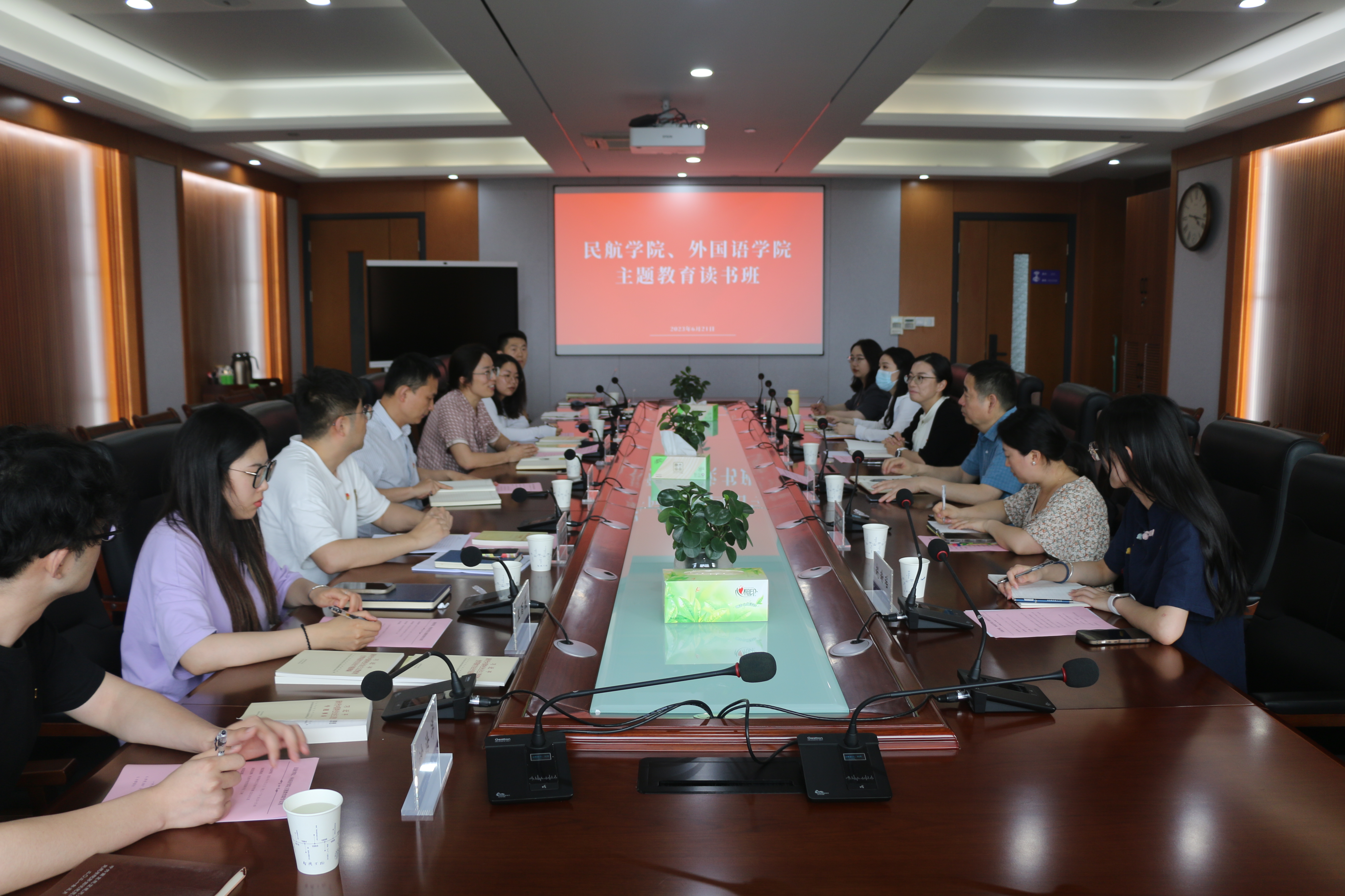 6月21日,午夜巴黎 、外国语学院学工、教学团队联合开展主题教育联合读书班,午夜巴黎 党委副书记王艳、副院长田勇,外国语学院党委副书记吴科颖、副院长徐以中,两学院全体辅导员参加读书班。