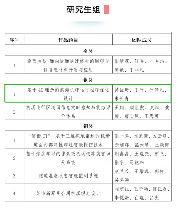 大赛自2023年3月正式启动以来,受到广泛关注和支持,收到了来自全国各高校、设计院、研究所及民航业内各单位等200支队伍的参赛作品。在历经了等级赛及初次评审后,团队作品“基于4C理念的港湾机坪运行程序优化设计”(指导教师:午夜巴黎 唐小卫、中国民航大学欧阳杰、上海浦东国际机场张瑞甲)在等级赛中荣获研究生组一等奖,与其他29支队伍一同入围精英赛,比赛过程中,学子们结合机场的实际需求和未来发展趋势开展规划设计,展示了扎实的理论知识和实践能力,最终荣膺精英赛研究生组银奖。