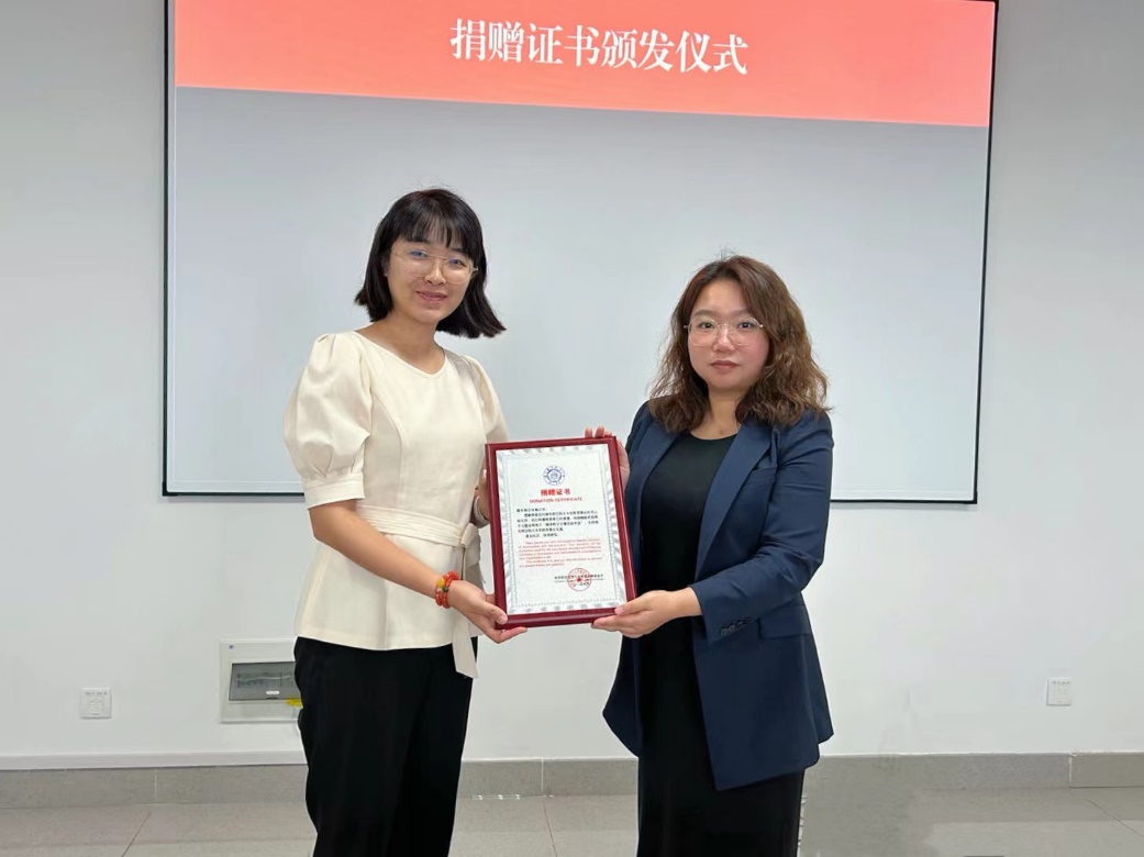 卢一亭向顺丰航空颁发捐赠证书,她表示,奖、助学金的设立是企业助力学校人才培养的生动体现,基金会将继续为捐赠方和学院做好服务,把企业捐赠用实用好。