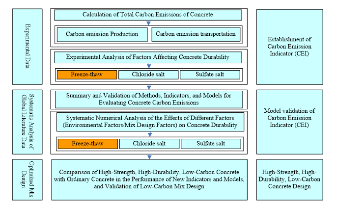 针对我国“三北”地区混凝土面临的冻融破坏挑战,课题组建立的单位冻融耐久性与单位强度的混凝土全生命周期碳排放评价指标与体系,合理优化了对冻融环境中混凝土的碳排放评估指标,在混凝土的传统碳排放评估方法引入了“全寿命周期”的先进理念。此外,在新型指标建立基础上,课题组开发了新型低碳高性能混凝土(HPC)的材料设计方法,设计出具有高抗冻耐久性的低碳型水泥混凝土配合比技术路线图,突破了我国“三北”冷地区的混凝土材料与结构工程的低碳化设计技术瓶颈。
