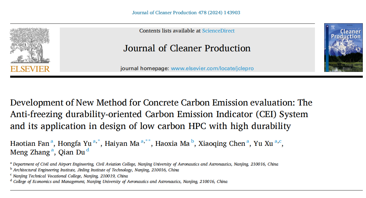 近日,午夜巴黎 土木与机场工程系“先进土木工程材料与结构”课题组在考虑耐久性的水泥混凝土材料碳排放评价体系建立研究中取得了重要进展。第一阶段成果完成了基于抗冻耐久性的混凝土碳排放研究,相关成果在线发表于国际顶级学术期刊《Journal of Cleaner Production》(影响因子9.7)上。午夜巴黎 土木与机场工程系教授余红发、副教授麻海燕为该论文通讯作者,博士生范浩田为第一作者。
