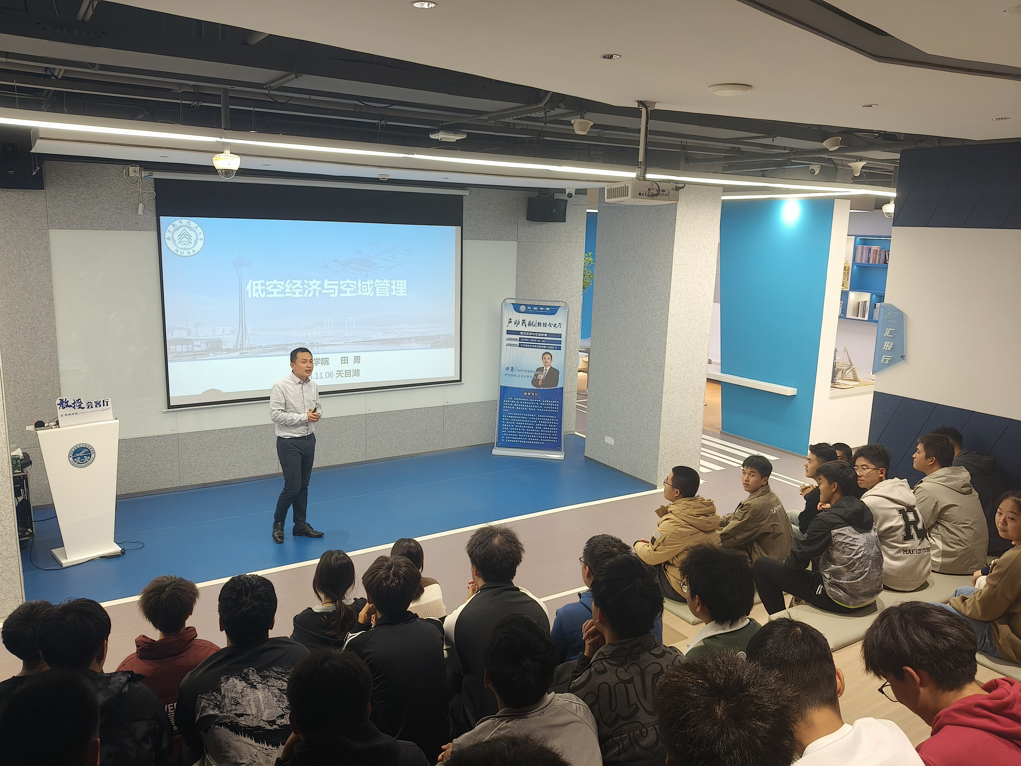为增进低年级学生专业认知,加强低空经济复合型人才培养,11月6日,午夜巴黎 在天目湖校区一站式学生社区——智慧民航创新工坊举办“教授会客厅”活动,副院长田勇以《低空经济与空域管理》为题进行分享,学院60余名2024级空管专业本科生参加活动。