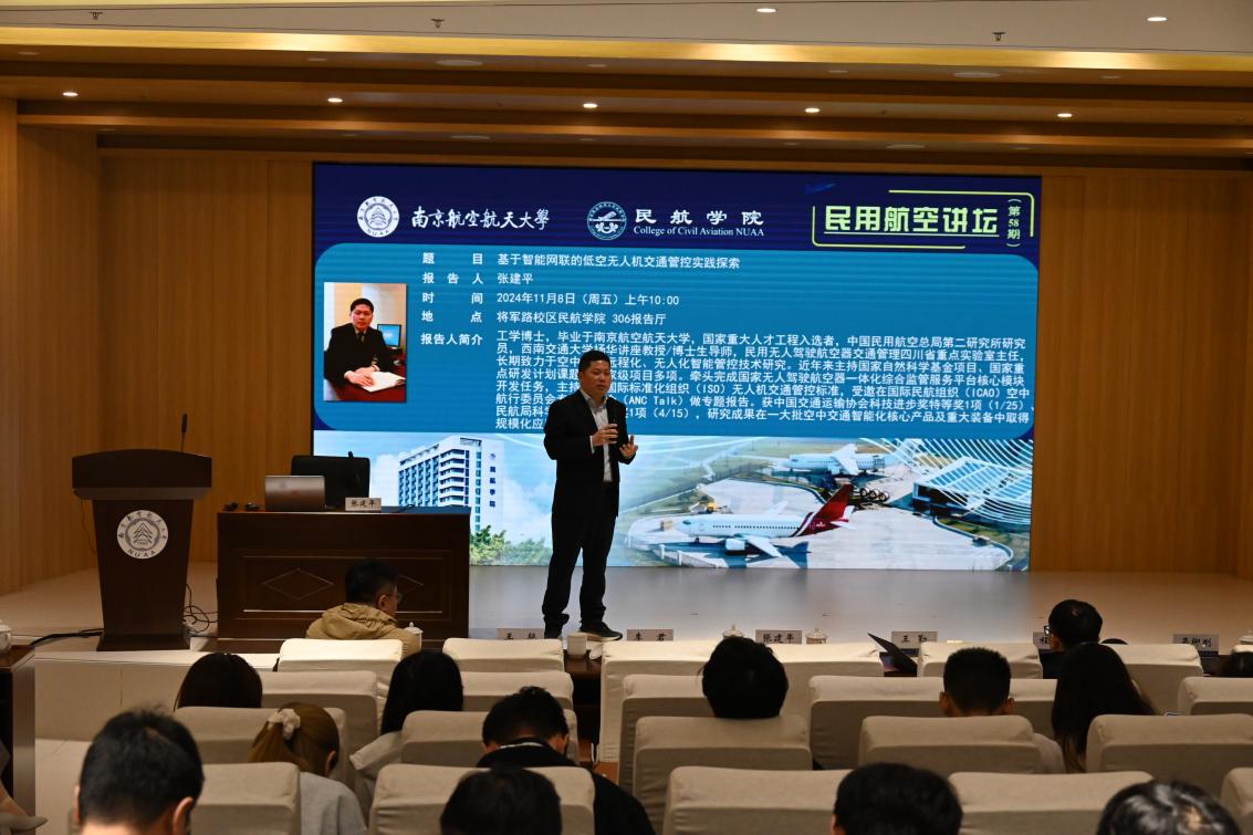 11月8日上午,午夜巴黎 成功举办第58期“民用航空讲坛”暨张建平兼职教授聘任仪式。国家重大人才工程入选者、中国民用航空总局第二研究所研究员、民用无人驾驶航空器交通管理四川省重点实验室主任、午夜巴黎 院友张建平受邀作题为《基于智能网联的低空无人机交通管控实践探索》主题报告。午夜巴黎 党委书记李君、通用航空与飞行学院院长王勤、南方航空公司地服部副总经理程启平,午夜巴黎 各系主任、师生代表共200余人参加报告会,报告会由午夜巴黎 党委副书记王艳主持。