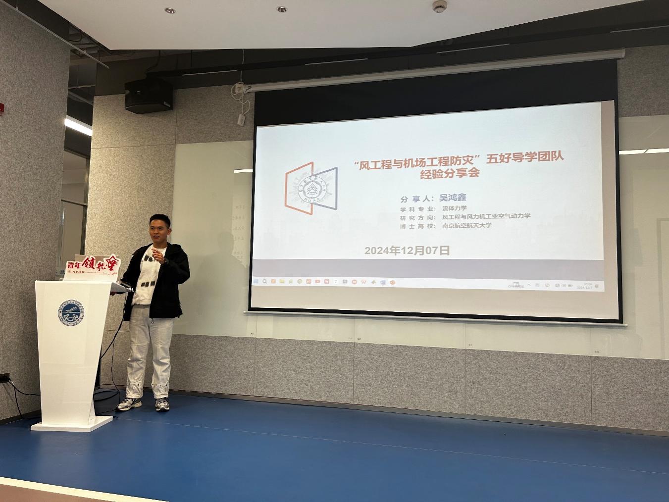 风工程与机场工程防灾“五好”导学团队研究生吴鸿鑫、毛竞竹结合自身在南航求学经历,分享了他们在专业学习、科创竞赛和国际交流等方面的心得,鼓励低年级同学在学习上多下功夫、在科创上多做尝试,不断提升专业素养。互动环节,与会师生就课程学习、未来发展规划等多方面进行深入交流和探讨。