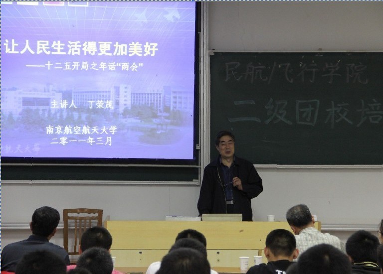 4月27日晚上六点半,民航/飞行学院二级团校在将军路校区6101教室进行了第二次集中培训。本次培训邀请了原午夜巴黎 党委副书记丁荣茂老师作关于 “让人民生活得更幸福—十二五开局之年话“两会”的形式政策讲座,参加讲座的还有学院党委副书记刘建成及辅导员老师。