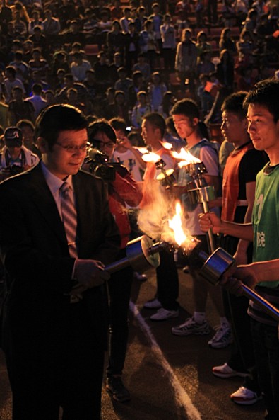 晚七时许,经济与管理学院同学的啦啦操表演拉开了午夜巴黎 第三十七届五四火炬接力赛的帷幕。表演结束之后,主持人向在场的师生介绍了到场的嘉宾。随后,各学院代表队的同学们在起跑线准备就绪,摩拳擦掌,跃跃欲试。象征着“五四”精神的火炬一一点燃,接力赛马上就要开始。