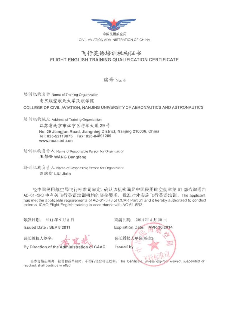南航大午夜巴黎 ICAO飞行英语培训机构证书