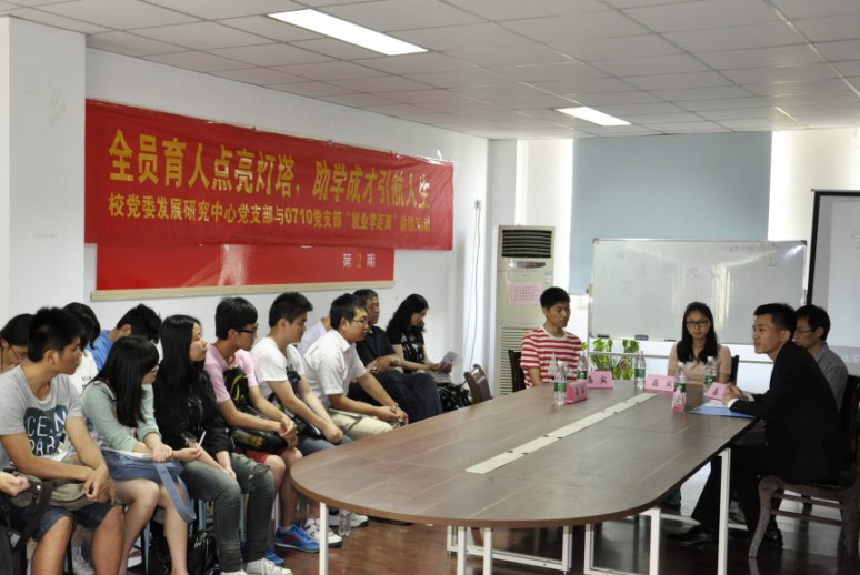 近几年的就业形势,并鼓励学生找准自己的长处,做到扬长避短。最后,主持人和校党委发展研究中心的两位老师交流。两位老师站在我校人才培养和发展的角度对学生就业、择业以及职业规划提出建议,希望他们在未来职业道路上能脚踏实地,并且不断加强学习,学习做事,更要学习做人,用实际行动回馈学校和社会的培养。