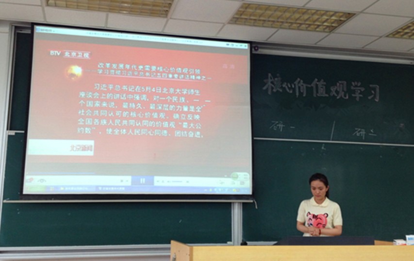 党支部书记汤淼提出了关于学习习近平总书记五四讲话重要精神的号召,接着主持人章莹将同学们带入了聆听总书记教导、提升自身价值观的良好氛围中。同学们首先观看了相关PPT展示,然后在一组分析讲解习总书记五四讲话要义的视频中,陷入了对自身价值观的审视和深深的思考中。之后,部分党员代表结合习近平总书记的重要讲话和自身经历,分享关于社会主义核心价值观及中国梦的感悟。习近平总书记的重要讲话是当代青年健康成长的行动指南,是推动新时期中国共产党事业实现新发展的纲领性文献,深刻揭示了实现伟大的中国梦与当代青年的密切联系。学生党员要发挥其自身的先锋带头作用,从小事做起,践行社会主义核心价值观。