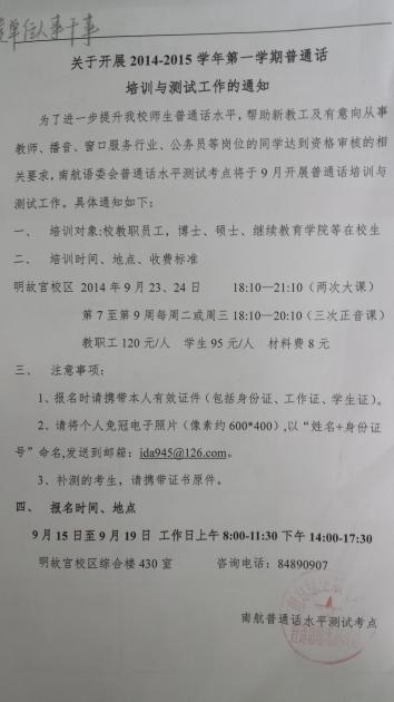 关于开展2014-2015学年第一学期普通话培训与测试工作的通知
