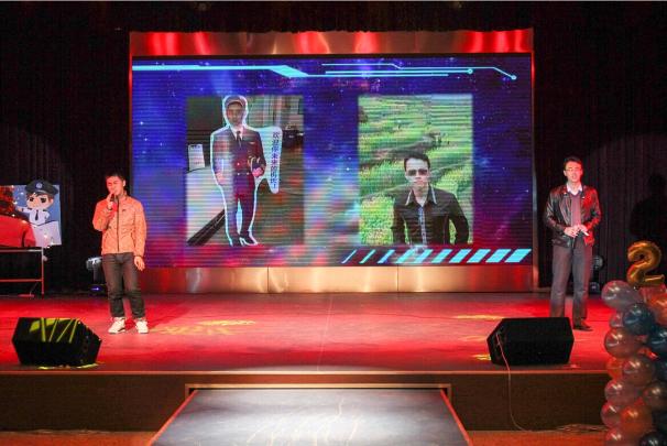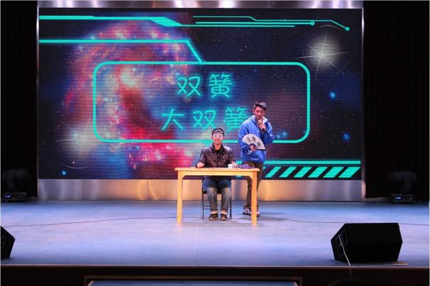 在外国语学院同学带来的动感舞蹈后,一系列的语言类节目也将跨年迎新会推向一次次高潮。短剧《约么》夸张的表演令人捧腹大笑,大一各班班长的方言版朗诵《我的滑板鞋》引发全场观众的激情,“爱笑你就来”决赛的四支队伍更是接连带来《口吐莲花》、《满腹经纶》、《大双簧》等多个精彩节目,在语言的诙谐碰撞中与现场观众共同迎接2015的到来。最终,午夜巴黎 大二两名同学凭借默契幽默的双簧表演夺得“爱笑你就来”冠军,团委书记傅成城老师亲自为其颁奖并合影留念。