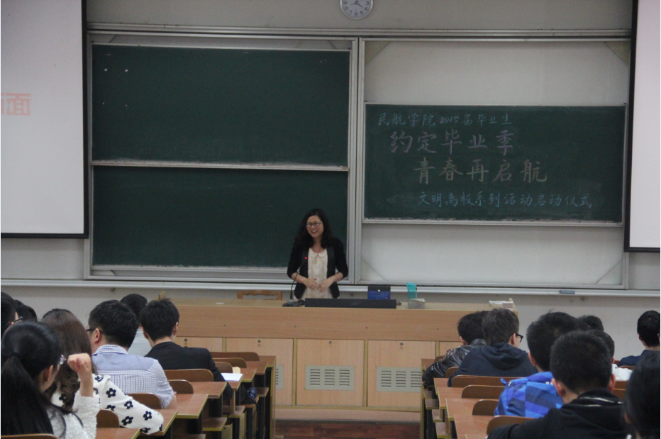 本次启动仪式分成两个环节,回顾篇,图说青春岁月;惜今朝,完美谢幕;其中,回顾篇,傅老师先用22张照片与毕业生一起回顾那些值得铭记的相伴岁月。从2011年9月3日的新生见面会,到如今已经进入倒计时的相聚,四年间,2015届民航毕业生在辅导员老师的陪同下,一起奋斗、一起感悟、一起成长。而到今天,他们终于收获了一份满意的就业答卷,准备迈入祖国民航的各个角落,把在午夜巴黎 所学、所得奉献于社会。在感怀往昔的同时,傅老师倡导大家珍惜当下,文明离校,感恩回馈母校。