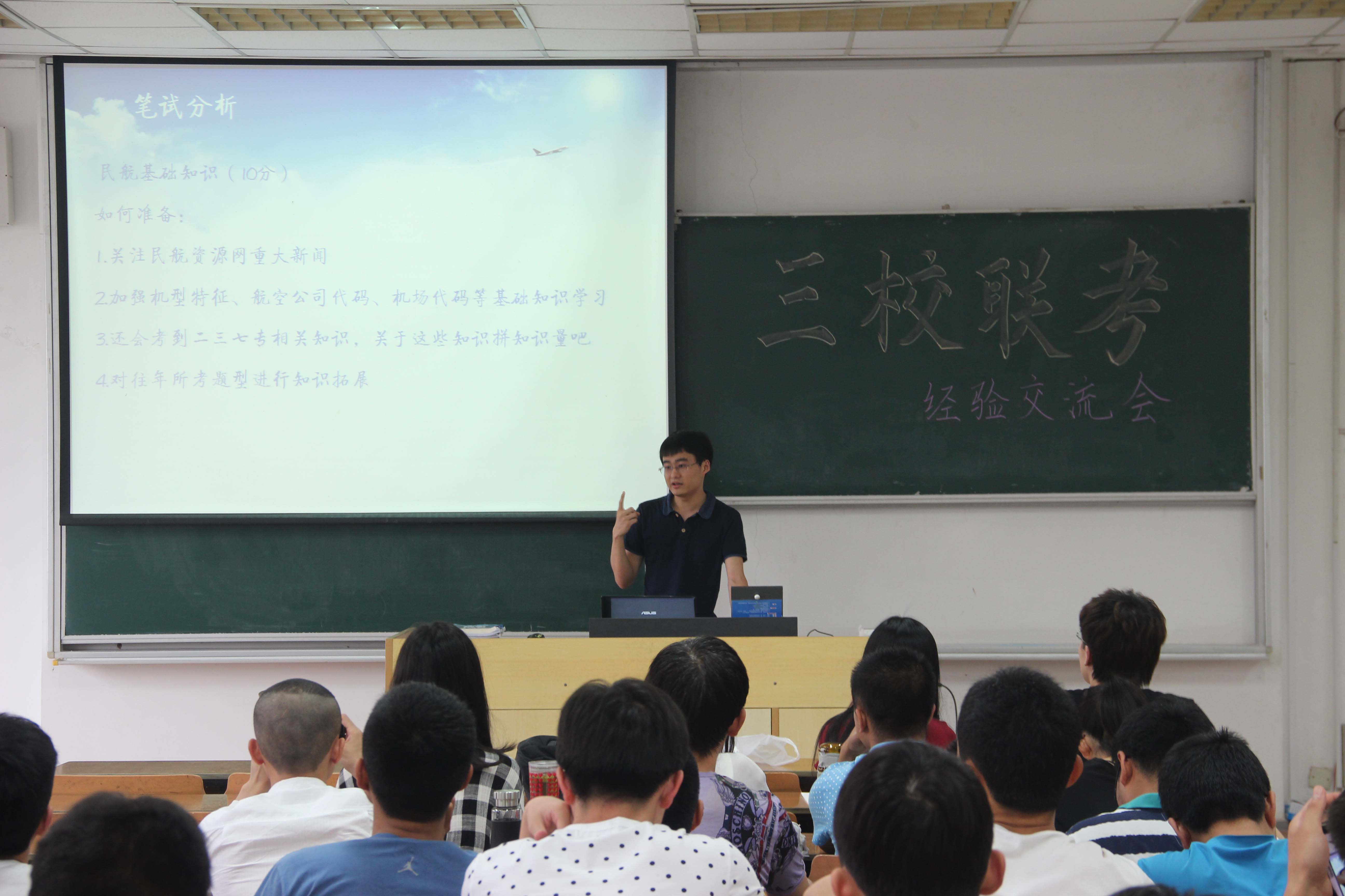 对于午夜巴黎 空中交通管理与签派专业的学生来说,就业空管各单位需要经过“三校联考”这一环节,所谓三校联考是由中国民用航空局空中交通管理局面向中国民航大学、中国民航飞行学院和我校举行的民航空管系统管制员招录考试。为了让空管专业学生更加顺利地通过考试,有资格参加各管制单位的面试,午夜巴黎 12级于5月26日下午4点,在6101教室举行了三校联考经验交流会,邀请到午夜巴黎 11级空管专业的优秀学生王挺和张雅雯对学生们进行集中辅导。