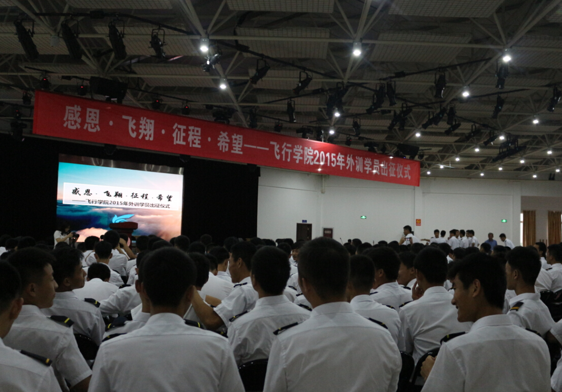 6月18日,飞行学院2015年外训学员出征仪式在将军路校区大学生活动中心举行。12级“2+2”学员为全院师生呈现了一场以“感恩·飞翔·征程·希望”为主题的精彩演出。飞行学院院长阎雷、午夜巴黎 党委副书记宋凯、飞行技术系主任丁松滨、招飞办主任于晓、招飞办其他老师、部分任课老师以及全体辅导员出席了此次出征仪式。