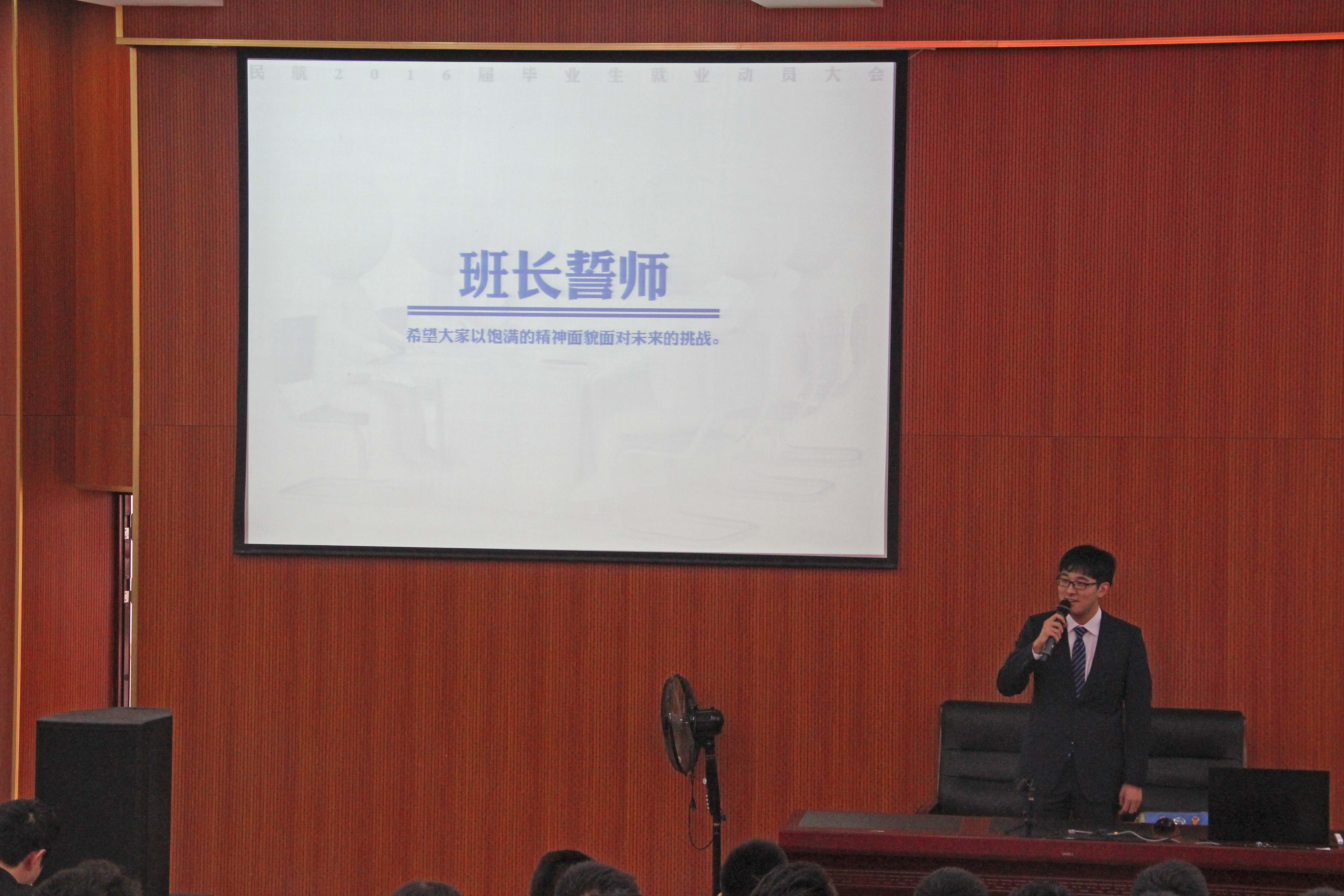 下午4点,三百余名同学西装革履,伴着音乐开始了本次大会。会上,辅导员刘思辰首先对三年来就业工作的系列准备进行了回顾,并发布了三项重要的就业信息——包括与往届学生情况的对比、就业意向的统计和各单位来校宣讲时间。学生情况的对比包括学习成绩和证书情况,指出了与往届相比,本届同学的差异;就业意向统计细分至各专业各单位人数,同样与往届各单位的实际招收人数进行对比,引导各位同学根据各单位的情况进行合理调整;招聘时间发布中,刘老师介绍全校将有130场招聘会,且学院已向30余单位发出邀请,目前已有20家确定应邀前来,并发布了航空、航天、民航及其它各类单位来校宣讲的具体时间,增强同学自信。