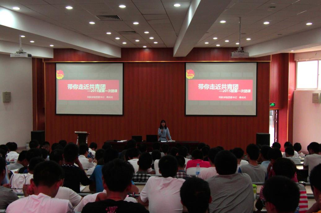 2015级新生第一次团课在2110教室顺利进行。此次团课由学院团委书记傅成成主讲,15级新生辅导员张秋寒及全体15级352名新生参加了此次课程。