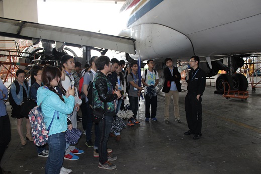 第一站,飞机维修机库,副总刘永建和我校05届校友杨琪共同讲解,他们将庞大的、结构紧密的飞机拆分成一个个小部分做了一次详细全面的讲解。同学们认真听课,眼神中充满着好奇和欣喜,更对机务工程师这份职业多一份崇敬。