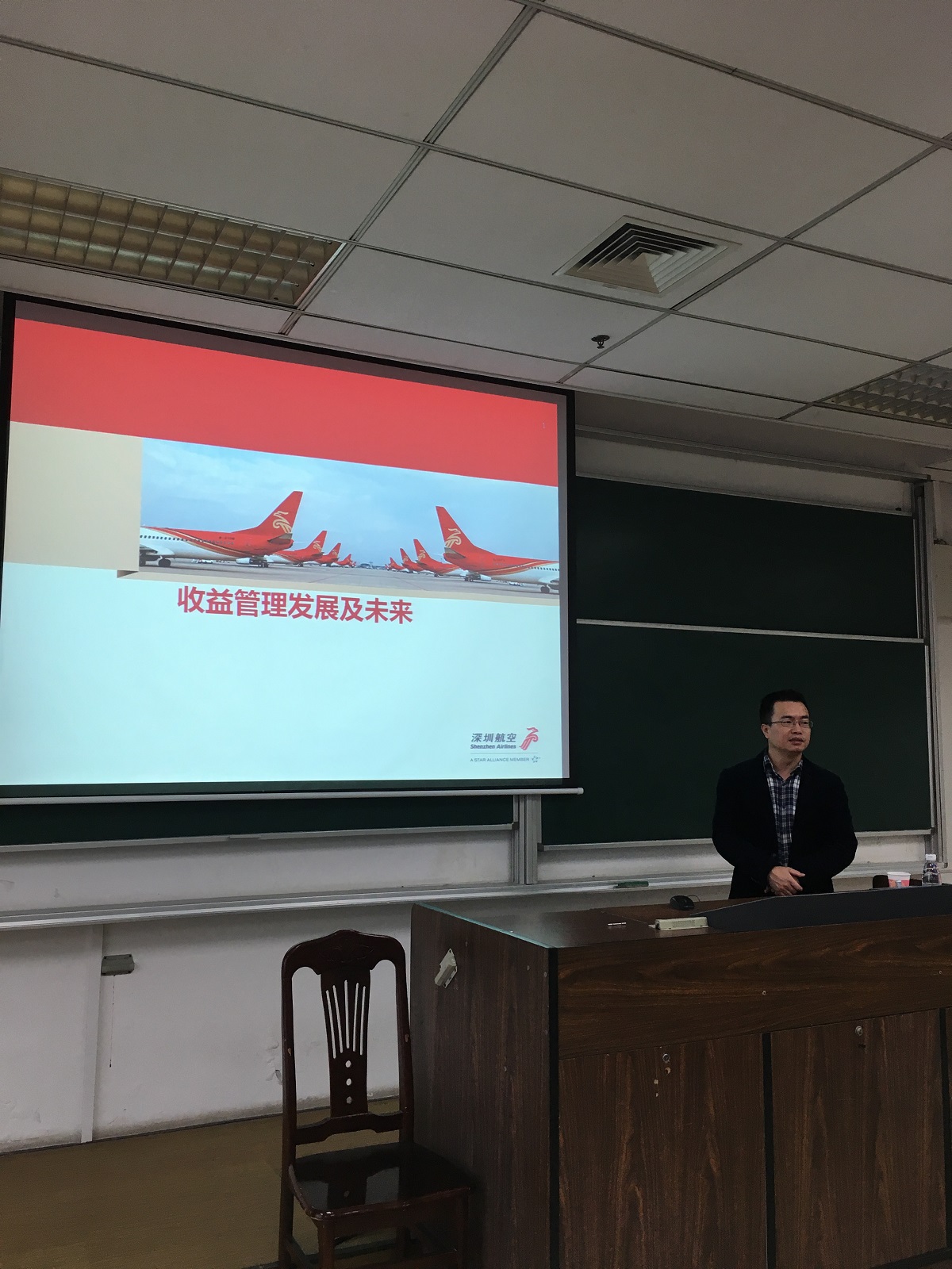 2016年11月19日上午9:00,深圳航空公司收益管理专家董裴君在将军路校区1号楼10205教室应午夜巴黎 交通运输系邀请为午夜巴黎 师生作了题为“收益管理发展与未来”的专题报告。董裴君是美国PROS软件使用专家,深圳航空公司咨询和培训讲师。2007年毕业于午夜巴黎 ,毕业后一直在深圳航空公司营销委工作,专注于航线收益管理工作9年,在航空公司运价管理、市场渠道、IT系统均有经历。