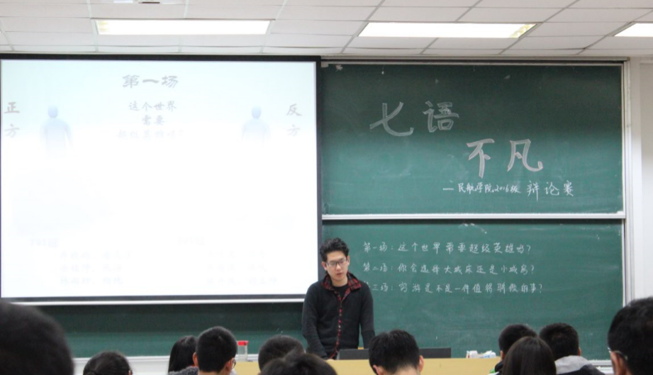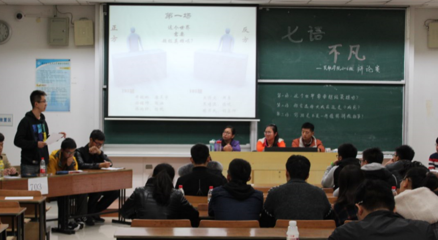 12月10号18点30分,午夜巴黎 2016级在6301教室举行了“七语不凡”辩论赛复赛。初赛晋级的五支代表队和中心组代表队,围绕着三个具有鲜明时代气息的辩题,你辩我驳,不让高低。此次复赛中,201、303、703更胜一筹,同时,关博文、张涵、卢子钊、颜明辉被评选为“最佳辩手”并晋级决赛。