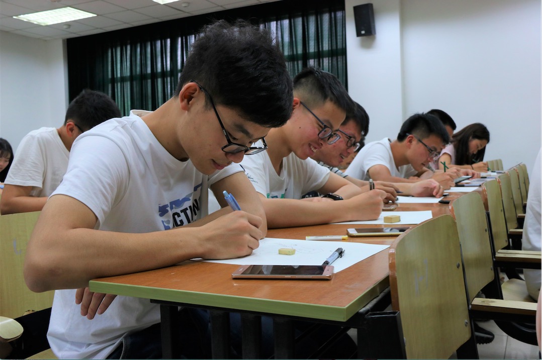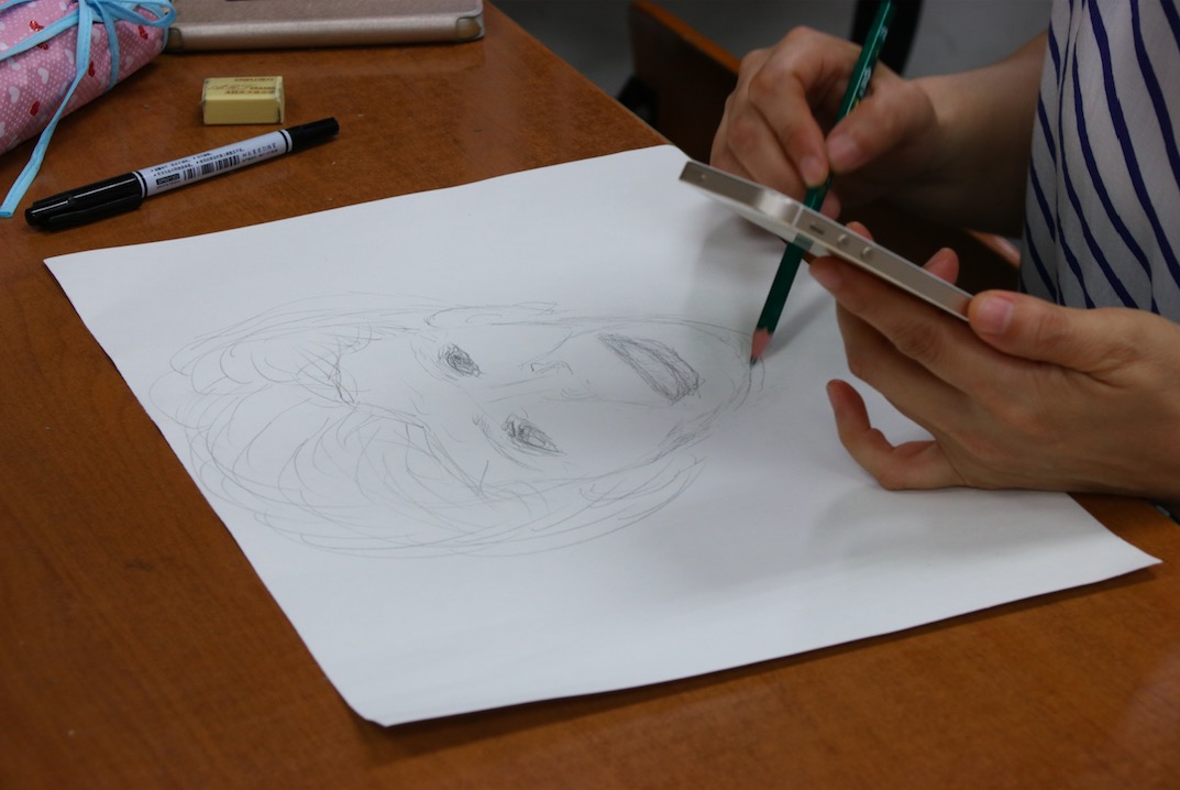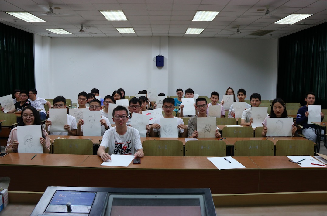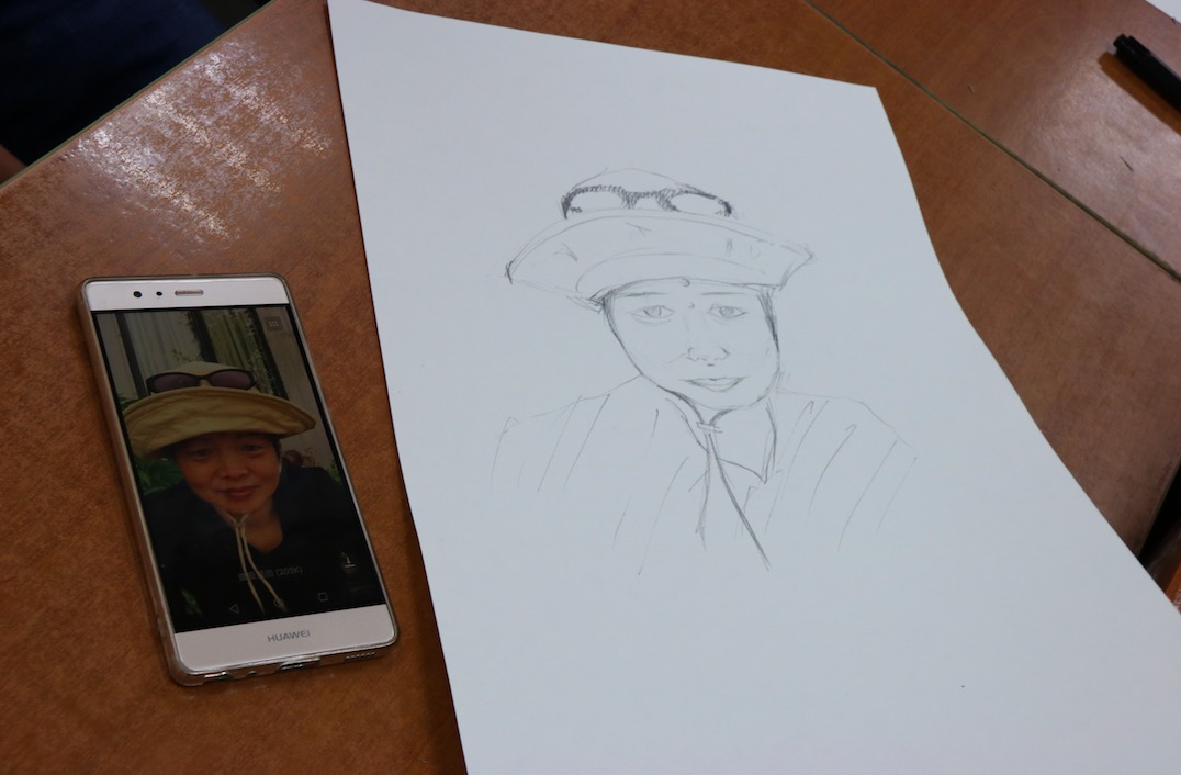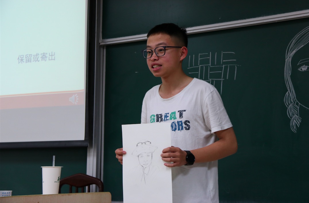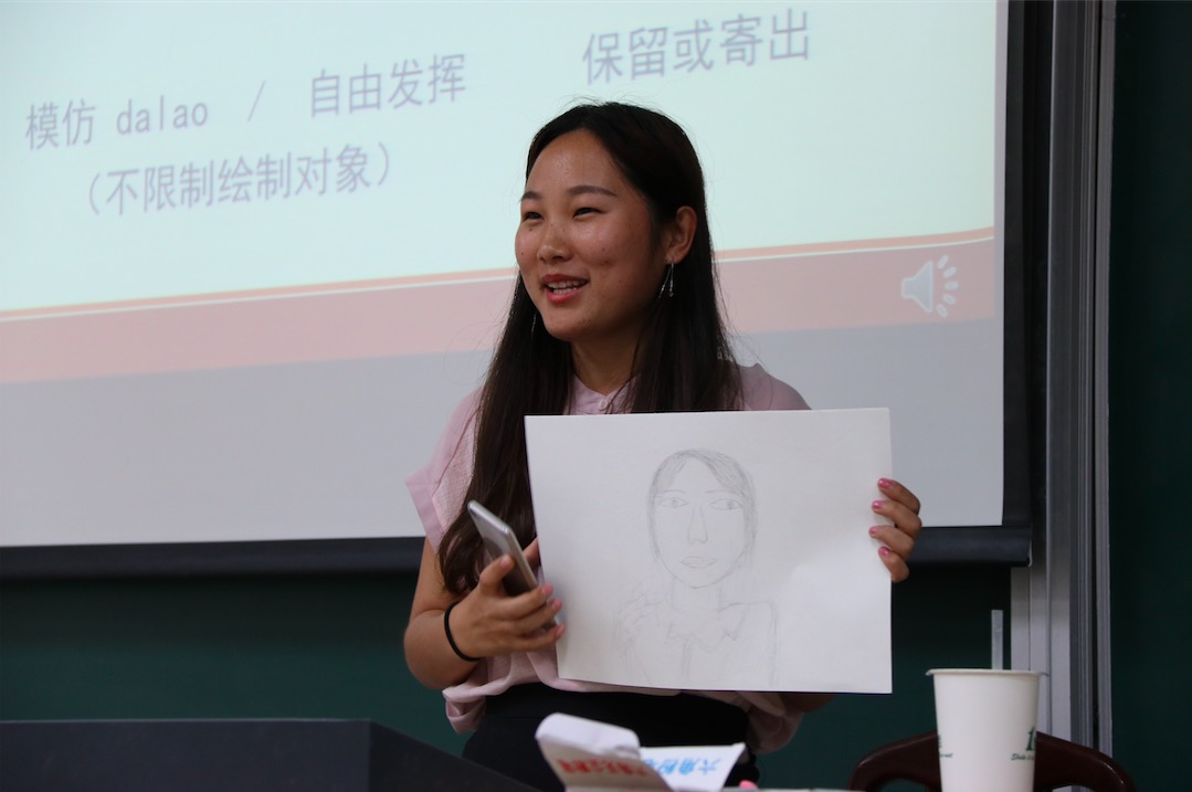 最有趣也是最具独特意义的第二部分开始了。首先,黄依宁同学担任起“绘画小教师”的职务,详细介绍了线描的基础知识和如何画好人物肖像画的技巧,并现场演示了对全身像和脸部肖像的绘画过程。