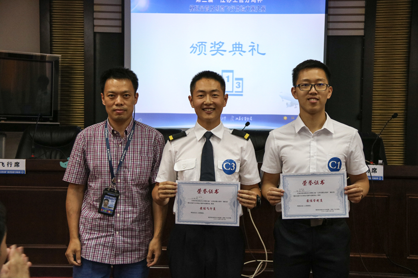 最终,“top gun”团队摘得桂冠,荣获一等奖; “CAVOK”团队和“威震天”团队荣获二等奖; “翼下之风”和“空军七号”团队荣获三等奖;“top gun”团队的石明钊和杜昭辰选手分别荣获“最佳管制员”、“最佳飞行员”称号。
