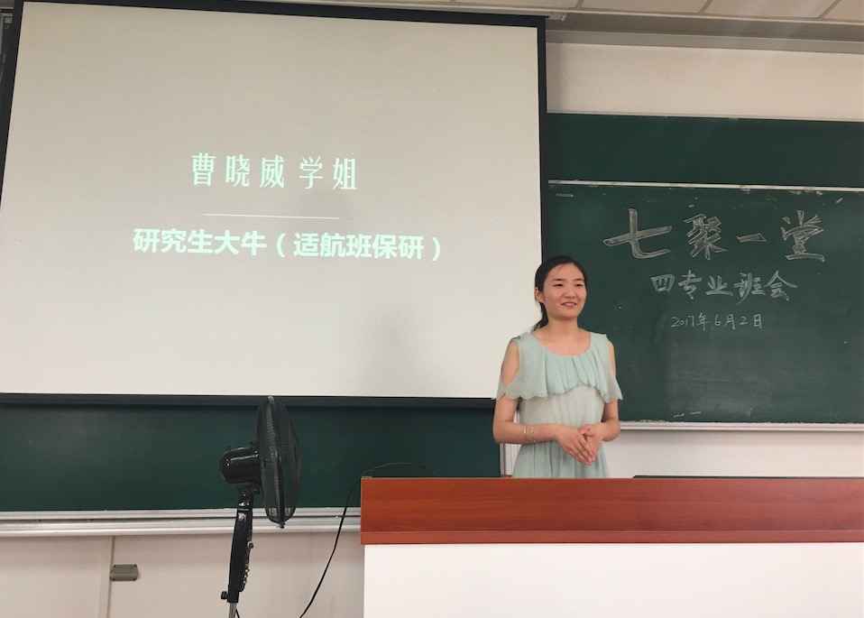 班会的第一个环节,是来自曹晓威学姐的学习和生活的经验分享。首先,学姐主要从学习上对自己的大学生活及读研的生活进行了简要的介绍。“功夫在平时”,学姐建议我们要充分利用好上课的时间,上课认真听的收益比课下自学的高得多。千万不要等到临近考试才开始学习,尽管考试也能通过,但学不到真正的知识,更不会巧妙运用知识。同时,学姐也希望同学们能逆水行舟,在往后的学习中能保持一颗初心,踏踏实实求学。