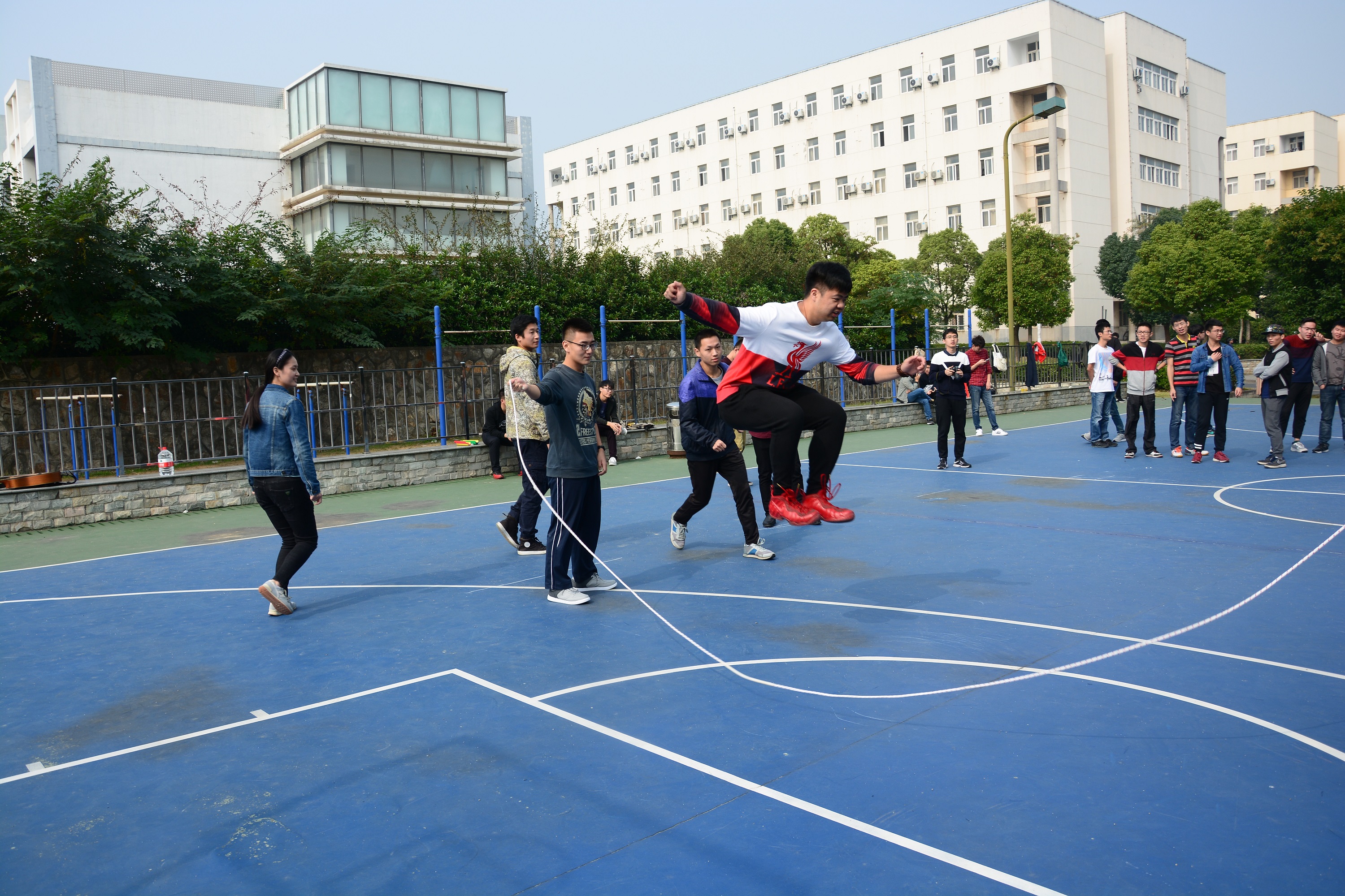 各个游戏中,对同学们的合作、想象能力要求最高的环节当属“你比我猜”这个游戏了。开展这个环节时,8个小组男女同学一齐上阵,站成一排,在要求无言语交流的情况下,通过自己的动作与神情将一个具体的词汇从队首传递至队尾。同学们天马行空的想象力和丰富多变的动作姿态赢得了其他同学们的欢声笑语,点燃了整个篮球场的气氛。除“你比我猜”之外,接下来的“传递乒乓”、“跳大绳”、“纸杯传水”、“怒吹乒乓”等丰富多彩的游戏环节同样吸引了同学们的注意,在场同学纷纷参与其中。