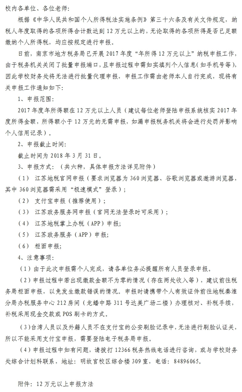 转发:关于自行办理2017年度年所得12万元以上纳税申报事项的通知