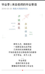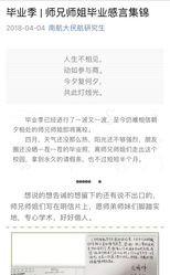 研究生三年的学习生涯中,每一步前行都离不开老师的引领与指导,每一份师生情都是最值得珍藏的记忆。毕业季,学院以师生情为主题开展了“毕业联播”系列活动,活动涵盖“来自老师的毕业寄语”、“毕业感言集锦”、“毕业祝福墙”三个子活动,通过语言文字、视频,记录毕业生们在午夜巴黎 三年研途生活的点滴过往。“来自老师的毕业寄语”活动,邀请各专业老师对即将毕业的2018届研究生们书写毕业寄语,劝勉毕业生在未来的人生道路上不畏失败、敢于拼搏。“毕业感言集锦”活动,通过手写明信片的形式,记录每一位毕业生三年民航生活的研途感悟和对南航校园生活的不舍,表达毕业生们与民航师生三年朝夕相伴的师生情,民航情;“毕业祝福墙”活动,邀请研一、研二的同学们将心中想对毕业师兄师姐说的话录制成视频,分享与师兄师姐朝夕相处的感动,送上最暖的祝福,并将视频拼接成一面“毕业祝福墙”,为即将离别南航生活的毕业生们送上最真挚的祝福。
