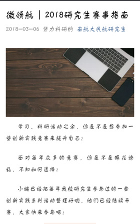 本次毕业季推出了“微领航”活动,包括大赛领航、期刊领航、就业领航三个模块。大赛领航为研究生们总结了以往的创新实践系列活动供大家选择,包括全国研究生数学大赛、全国研究生未来飞行器创新大赛等。期刊领航以数据说话,向研究生们展示2017年度午夜巴黎 论文发表情况。就业领航为大家送上一周的南京实习列表,让大家在科研之余,积极实践,为未来更好的融入社会打下基础。