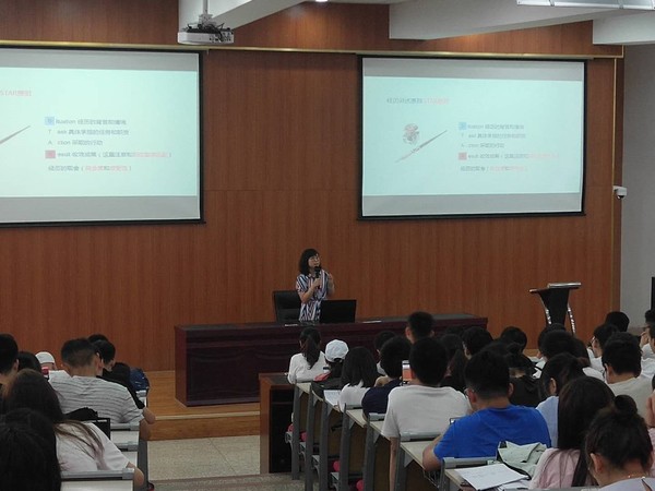 之后,年级辅导员张秋寒老师为大家说明了本学期接下来的注意事项,以及简要介绍了无领导小组讨论的注意要点。