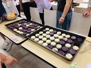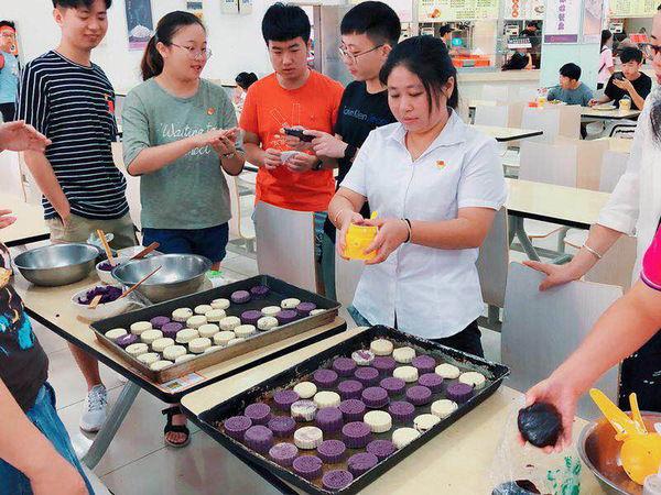 大家一同包着月饼、一同话着家常,彼此从陌生到熟悉,手法也从生硬到熟练。很快,九十余个紫薯和枣泥馅的月饼在大家的巧手中诞生了。